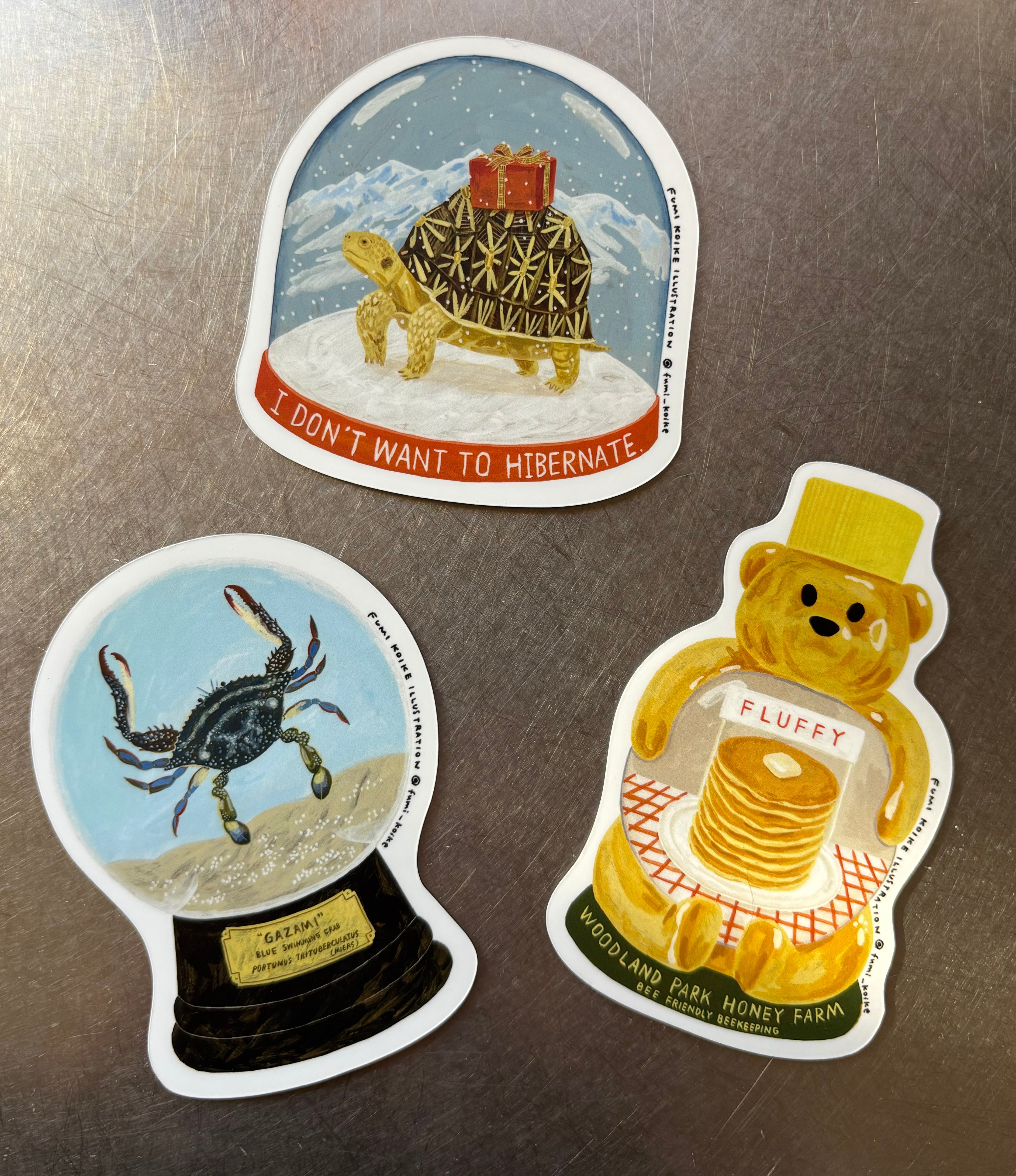2023年12月に表参道のHB Garellyで開催した個展に向けて制作したスノードームシリーズのイラストのマグネットです。スノードームシリーズは家族との日常の中からインスピレーションを受け、制作したシリーズ。その当時の我が子が夢中になったものや発した言葉に私自身が影響を受けたものをスノードームに閉じ込めておきたくて描いたものです。