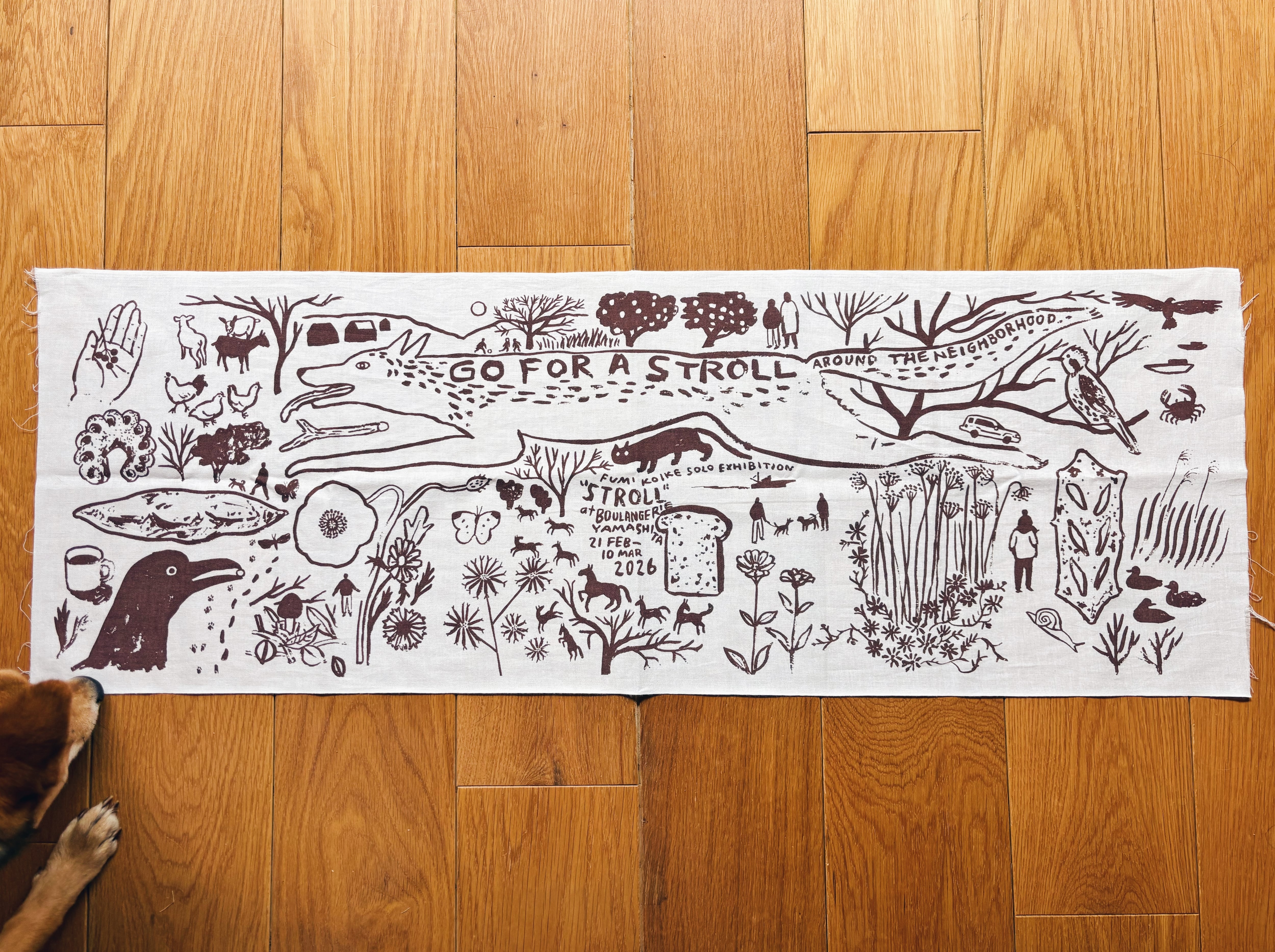 2026年2,3月に神奈川県二宮町のパン屋Boulangerie Yamashitaで開催した個展”STROLL”のオリジナル手ぬぐいです。グリーンは会期中に完売してしまったため、ブラウンのみ数量限定で販売します。